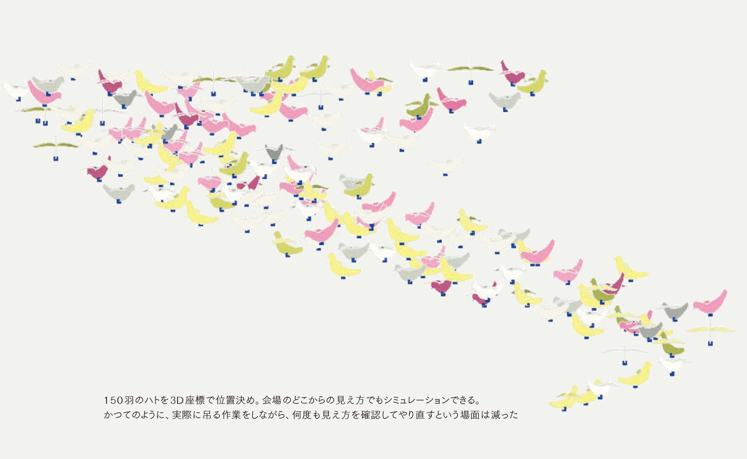 例如,我们曾被委托在一个大厅里创建一个展示,其中有 150 只鸽子在头顶空间飞翔。鸽子一只接一只地悬挂在天花板上,但使用二维绘图将 150 只鸟定位在三维空间中非常耗时。纠正工作同样困难。使用程序创建 3D 图像并在检查其实际外观的同时进行操作似乎更为现实。此外,当需要提出多个概念设计时,从时间或体力上来说,手工完成根本不可能。借助 BIM,您可以通过调整参数(例如鸽子的密度或飞行曲线)来创建不同的概念设计。”(Taenaka)