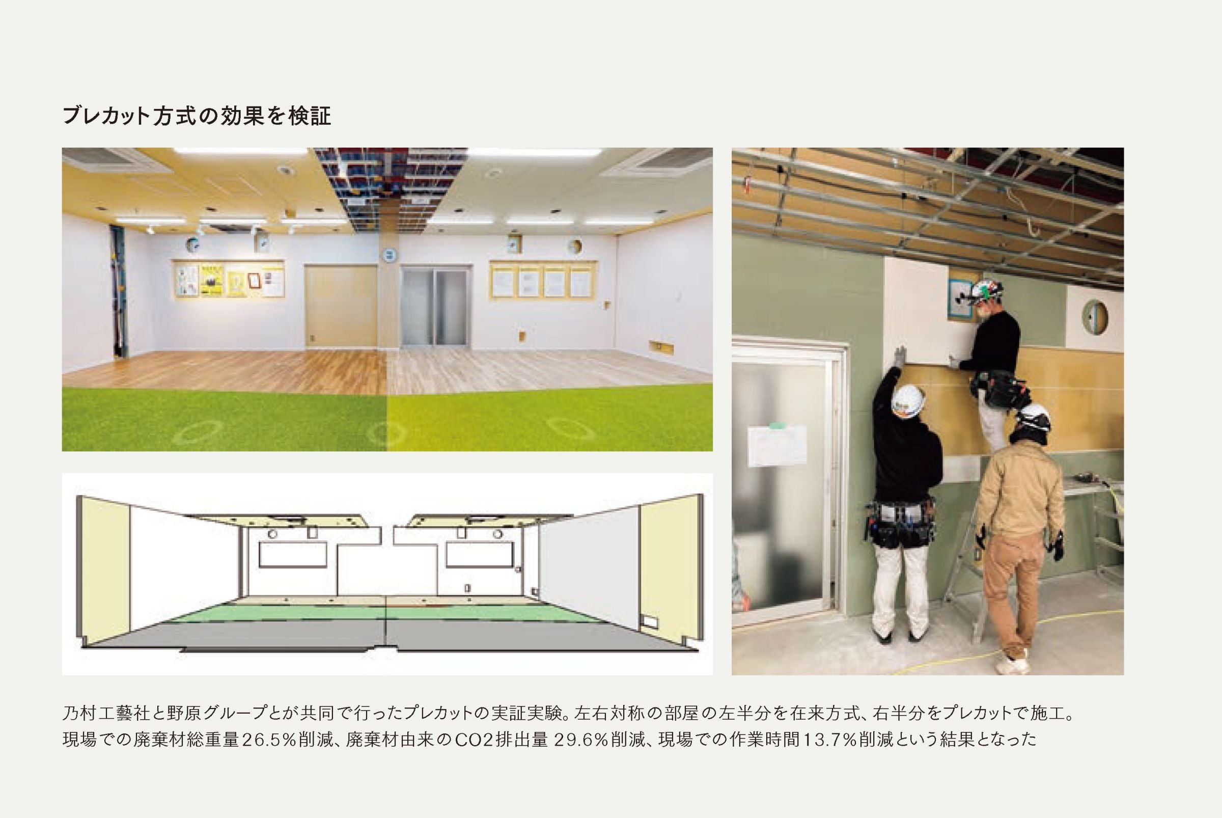 因此,由于有些地板在未使用预切割的情况下进行,我们能够获得比较数据,以了解传统施工和预切割施工之间的差异有多大。 首先,在工作效率方面,工匠每单位时间内可以加工的石膏板数量约为传统预切法的 1.8 倍。 此外,使用预切割方法,由于不是在现场切割,因此浪费更少。 石膏板的废弃物减少约 15%,金属基材的废弃物减少约 30%。