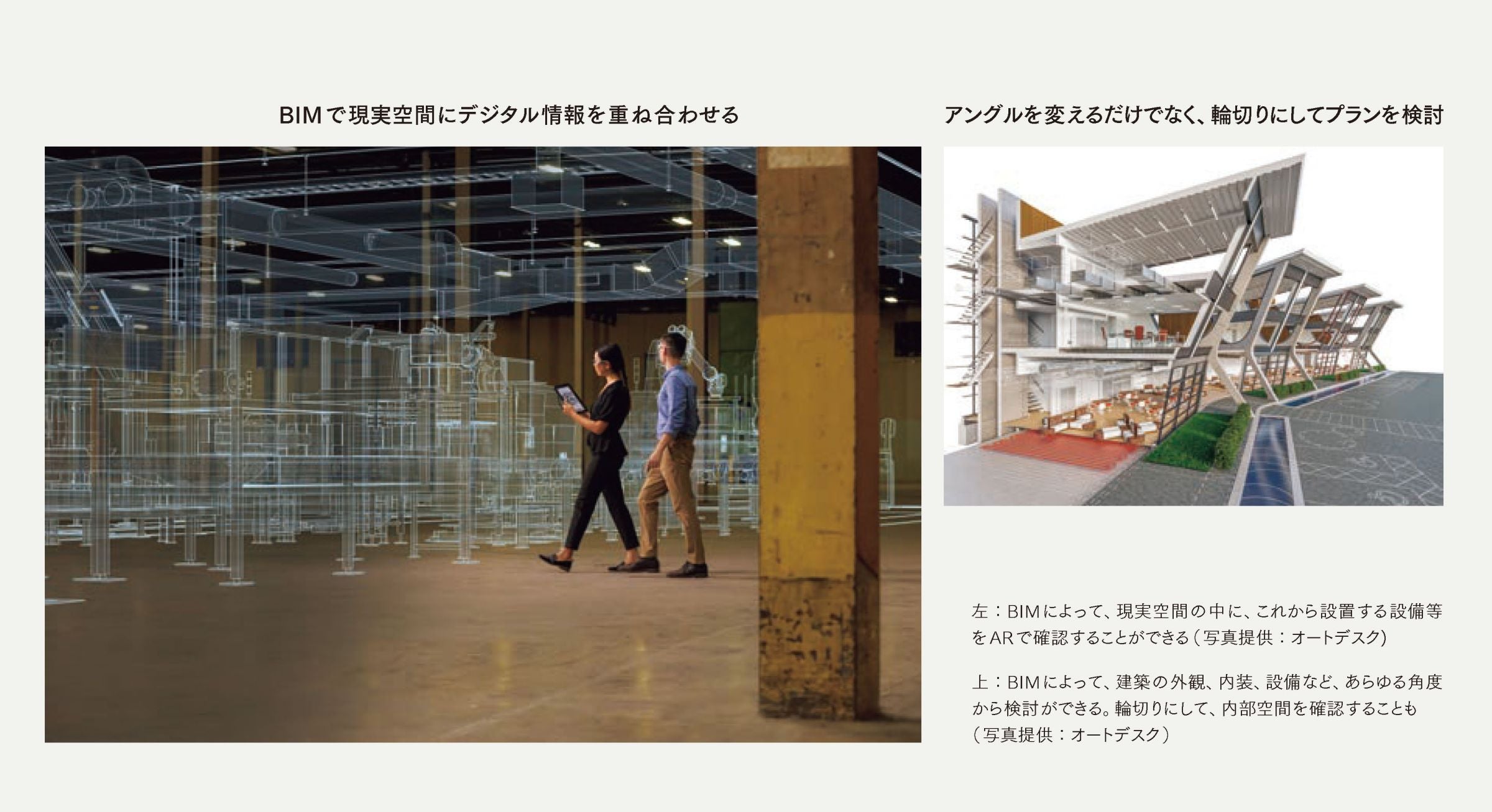 在众多支持空间创造的技术中,BIM(建筑信息模型)是目前最值得关注的技术之一。BIM 不断发展,有望彻底改变从空间构想・设计到现场施工工作流程。同时,它还能帮助客户更轻松地获得具体的空间形象,从而快速灵活地响应各种需求。此外,BIM 还有望减轻环境负担。