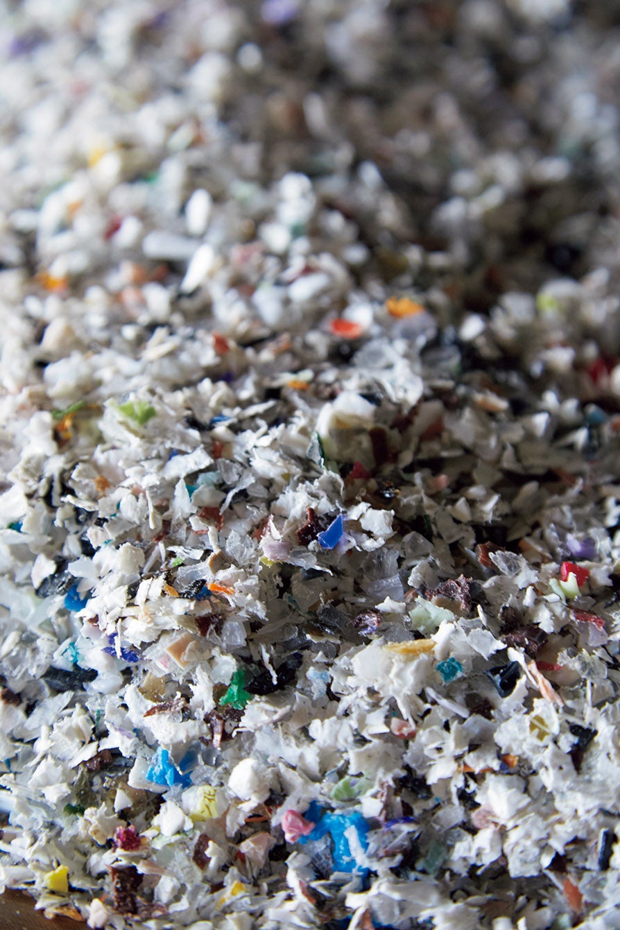 例如,滑雪鞋每三年更换一次型号,这会造成大量浪费。它是一种复合材料,内部有铝配件和纤维,但在去除铝之后,我将其压碎并按压。当您通过改变混合比例进行测试时,您将想出一个可以生产适当板材的配方。