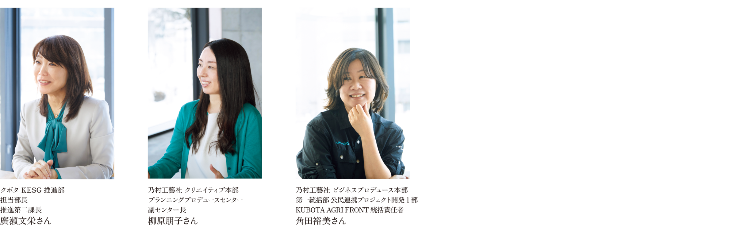 「提案されたコンセプトを見て、これだと思いました。そのキーワードで、KUBOTA AGRI FRONTの根っこというか、核が決まったんです。つまり、施設が竣工してプロジェクトが終了するのではなくて、施設の竣工からスタートして成長していくプロジェクト。食と農業という人間にとって共通のテーマに対して、時代が遷り変わっても進化を続ける。それは、農業機械や水道インフラといった時代を超えた事業を手掛けるクボタらしい施設にもなり得ます。そんな意義が、このコンセプトに集約されていると思いました」 (廣瀬さん)