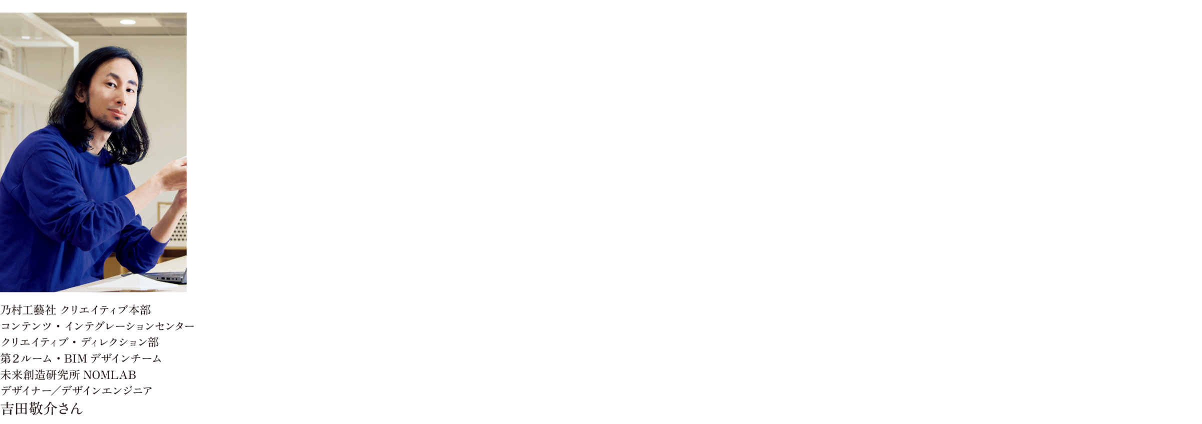 株式会社乃村工藝社 クリエイティブ本部 コンテンツ・インテグレーションセンター クリエイティブ・ディレクション部 第2ルーム・BIMデザインチーム 未来創造研究所 NOMLAB デザイナー/デザインエンジニア 吉田敬介