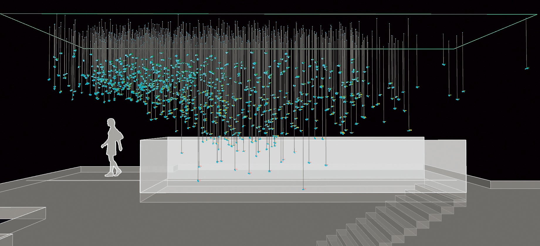 そして、プログラム上で花びらの動きを検証し、美しく見える一瞬を固定して、実際のものをつくりました。1枚ずつの花びらのXYZ座標を抽出して位置を決め、天井から吊るんです。風で流れる花びらは、向きや傾きによって見える形が違ってきます。その形すべてを再現するのは無理ですので、それもプログラムを書いて近似したパターンに置き換えました。結局、20種類のアクリル製の花びらをつくりました」