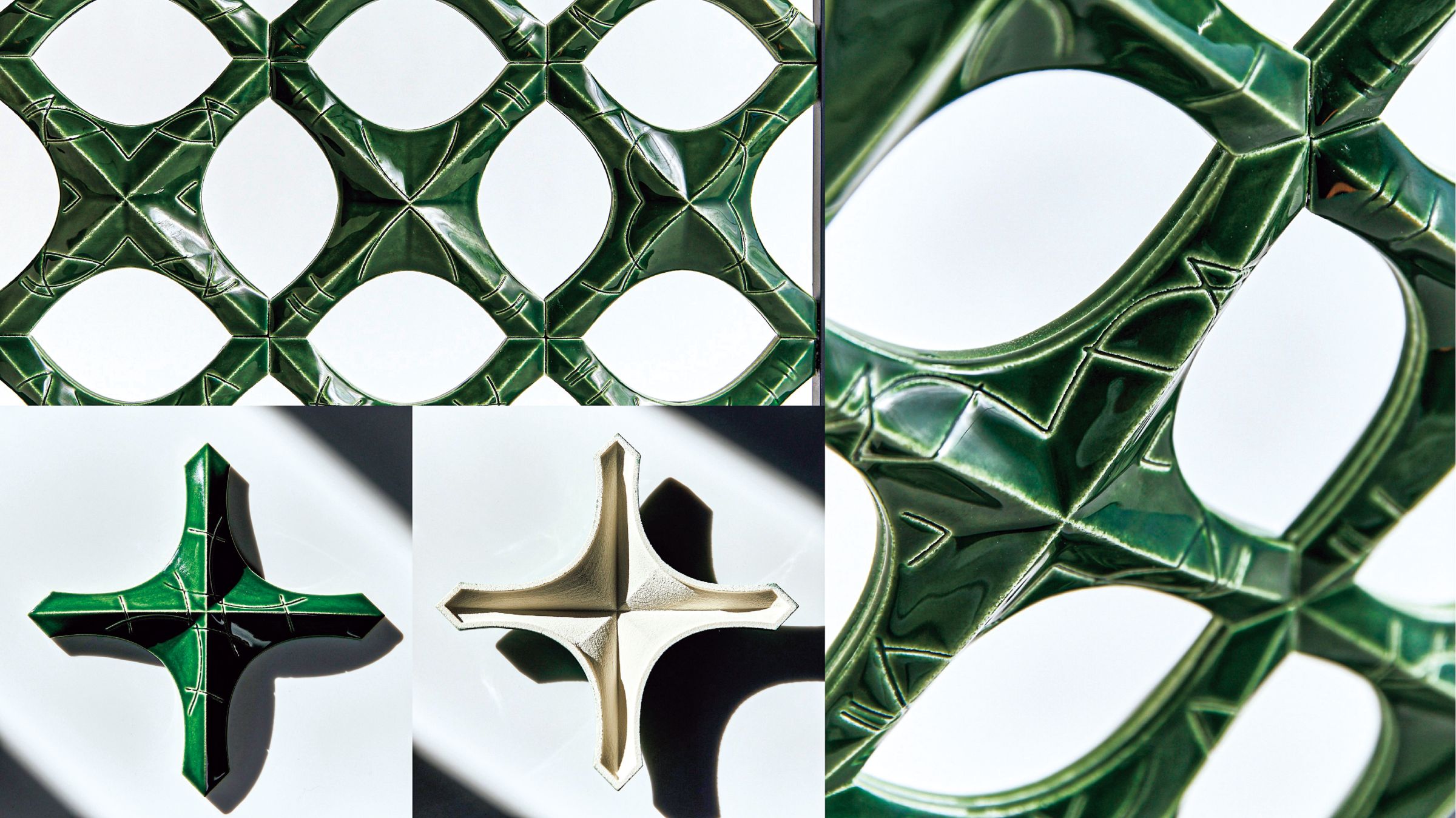 3Dセラミックタイルでつくったファサード。手づくりのタイルでは、スケルトンで組めるこの精度は出ない。