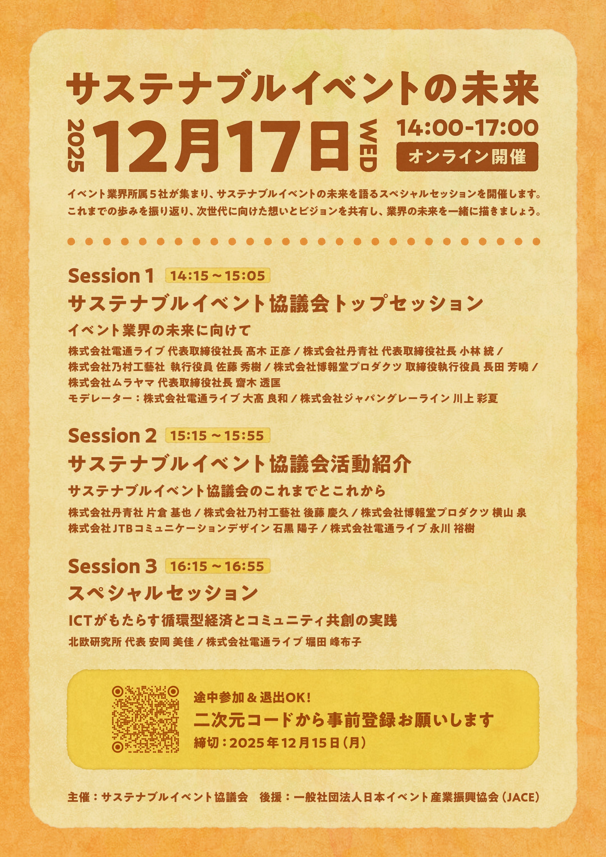 The Sustainable Events Council, of NOMURA Co.,Ltd. is a member, will hold a webinar on Wednesday, December 17, 2025, to discuss the future of sustainable events, an important issue that the entire industry must address. Speaking from our company will be Hideki Sato, Executive Officers Deputy General Manager of the Sales Promotion Division, and Yoshihisa Goto, Room Chief of the Sustainable concept design Lab, Vision concept design Department, Future Creation Research Institute.