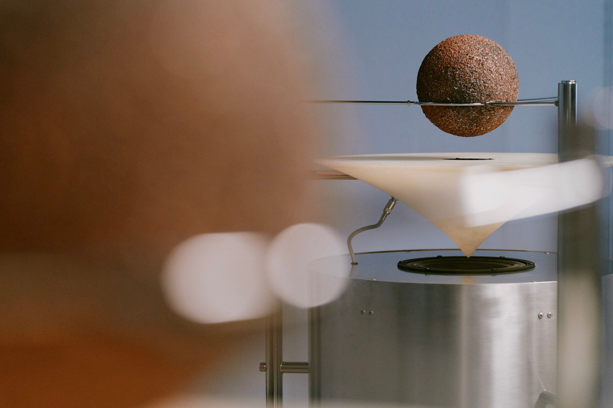 鉄・銅・アルミなど地球の元素である無機質な金属を一度完全に溶かし、有機的な形に再構築することで、素材の記憶を表現。宙に浮かぶ架空の鉱物を想起させ、ロケットが夢見たロマンを描いています。