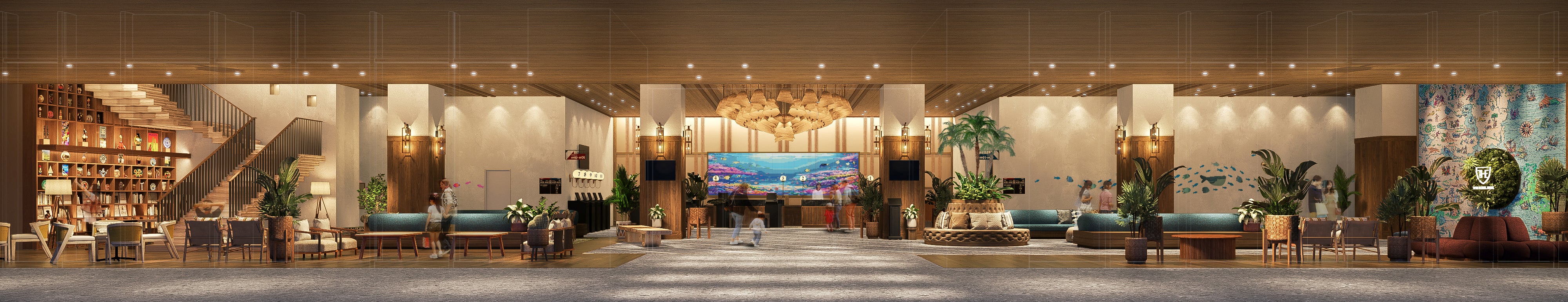 楽しい気持ちで帰ってきたゲストの高揚感が続き、これから出発するゲストのわくわく感を盛り上げる、リゾート感あふれるエントランス。きらきらと揺らめく海中を表現したアートで迎え、吹抜け階段には世界の旅土産をディスプレイしています。